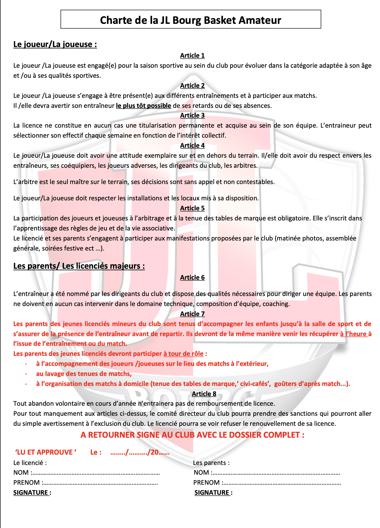 Charte de la JL Bourg Basket Association